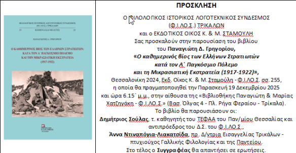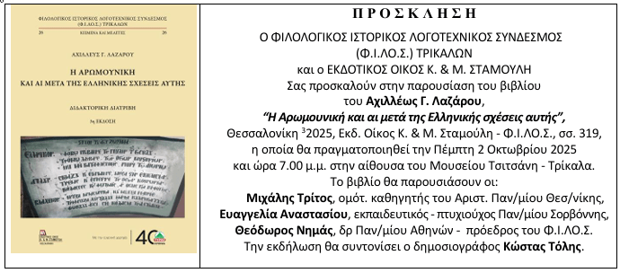 Με μικρή καθυστέρηση, λόγω του ότι περιλαμβάνει τα «Πρακτικά του 13ου Συμποσίου Τρικαλινών Σπουδών», το οποίο διεξήχθη προσφάτως (Νοέμβριος 2025), θα κυκλοφορήσει έως το τέλος Ιανουαρίου 2026 ο 45ος τόμος (2025) του ετησίου επιστημονικού περιοδικού «ΤΡΙΚΑΛΙΝΑ». Ήδη ο τόμος έχει σταλεί προς εκτύπωση. Τα «ΤΡΙΚΑΛΙΝΑ» εκδίδει ανελλιπώς από το 1981 ο Φιλολογικός, Ιστορικός, Λογοτεχνικός Σύνδεσμος (Φ.Ι.ΛΟ.Σ.) Τρικάλων.