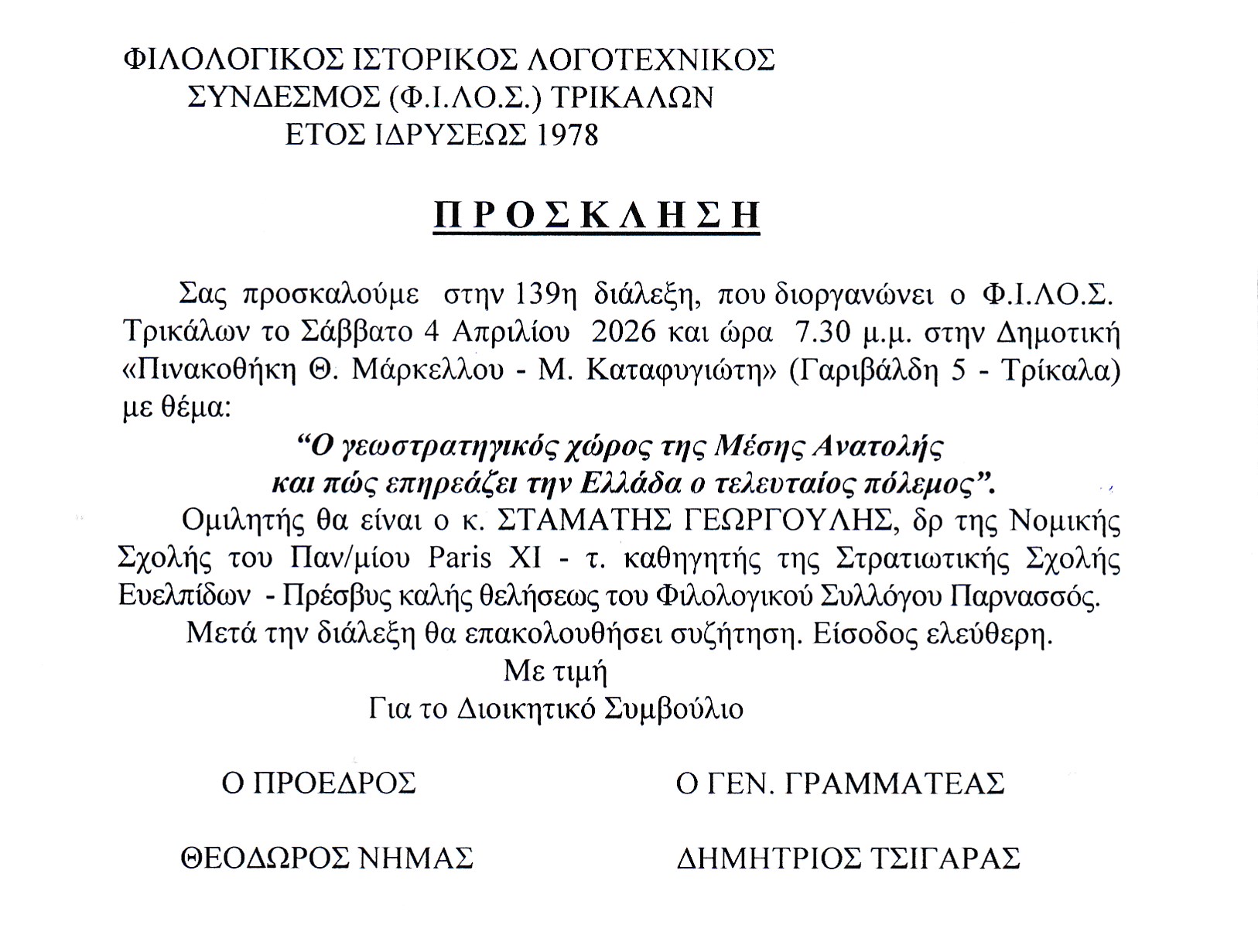 Το προσεχές Σάββατο 4 Απριλίου και ώρα 7.30 μ.μ, στην αίθουσα της Δημοτικής «Πινακοθήκης Θ. Μάρκελλου – Μ. Καταφυγιώτη» (Γαριβάλδη 5 – Τρίκαλα), θα πραγματοποιηθεί η 139η διάλεξη του Φιλολογικού, Ιστορικού, Λογοτεχνικού Συνδέσμου (Φ.Ι.ΛΟ.Σ.) Τρικάλων με θέμα: “Ο γεωστρατηγικός χώρος της Μέσης Ανατολής και πώς επηρεάζει την Ελλάδα ο τελευταίος πόλεμος”. Ομιλητής θα είναι ο κ. ΣΤΑΜΑΤΗΣ ΓΕΩΡΓΟΥΛΗΣ, διδάκτωρ της Νομικής Σχολής του Παν/μίου Paris XI – τ. καθηγητής της Στρατιωτικής Σχολής Ευελπίδων – Πρέσβυς καλής θελήσεως του Φιλολογικού Συλλόγου Παρνασσός. Μετά την διάλεξη θα επακολουθήσει συζήτηση. Είσοδος ελεύθερη.