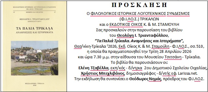 Παρουσίαση βιβλίου Θ.Ι. Τριανταφύλλου «Τα Παλιά Τρίκαλα. Αναμνήσεις και Ιστορήματα» Εικόνα Posted on 28 Απριλίου, 2026 by moysiadis Κοινοποιήστε: Στείλε ένα σύνδεσμο σε έναν φίλο(Ανοίγει σε νέο παράθυρο) Email Mοιραστείτε στο Facebook(Ανοίγει σε νέο παράθυρο) Facebook Μοιραστείτε στο X(Ανοίγει σε νέο παράθυρο) Χ