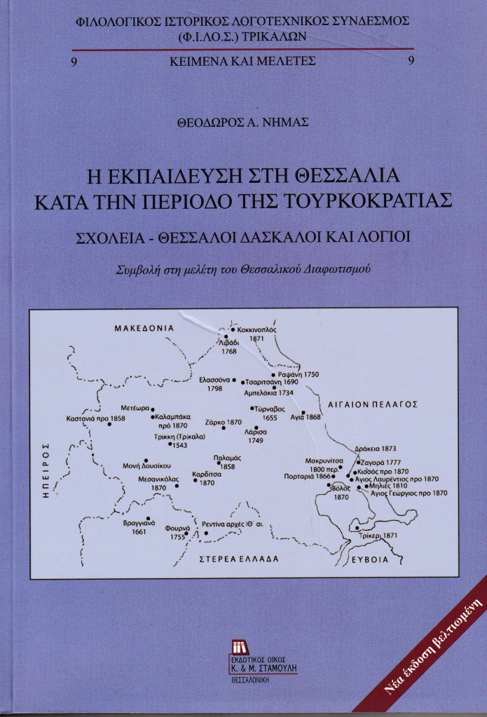 Το υπό παρουσίαση βιβλίο αποτελεί μία από τις σημαντικότερες εκδόσεις του Φιλολογικού, Ιστορικού, Λογοτεχνικού Συνδέσμου (Φ.Ι.ΛΟ.Σ.) Τρικάλων και του Εκδοτικού Οίκου Κ. & Μ. Σταμούλη (Θεσσαλονίκη, τηλ. 2310-264748, 6946-461460). Πρόκειται για το υπ’ αρ. 24 βιβλίο της σειράς «Κείμενα και Μελέτες» του Φ.Ι.ΛΟ.Σ., που περιλαμβάνει ένα από τα σπουδαιότερα έργα του φιλολόγου και διδάκτορα ιστορίας της Εκπαιδεύσεως Θεοδώρου Α. Νημά με τίτλο «Η οθωμανική απογραφή του 1454/55 στο Σαντζάκι Τρικάλων (Θεσσαλία – Πιερία – Ευρυτανία – Ναυπακτία – Δυτ. Φωκίδα και άλλα όμορα)» και με υπότιτλο «Ονόματα κατοίκων, κτηνοτροφία, γεωργική παραγωγή, φόροι κ.ά.». Το ογκώδες αυτό βιβλίο των 744 σελίδων σχήματος 24Χ17 εκ., που είναι ο καρπός πολύχρονης κοπιαστικής μεταφραστικής εργασίας και μελέτης, πραγματεύεται την οθωμανική απογραφή του 1454/55 στο Σαντζάκι Τρικάλων, το οποίο τότε περιλάμβανε μία πολύ μεγάλη έκταση, ήτοι ολόκληρη τη Θεσσαλία, την Πιερία και άλλα χωριά της Δυτ. Μακεδονίας έως τον Αλιάκμονα προς Βορράν, το Μέτσοβο και τα υπαγόμενα σ’ αυτό χωριά της Ηπείρου, την Ευρυτανία, τη Ναυπακτία και μερικά χωριά της Δυτικής Φωκίδας.
