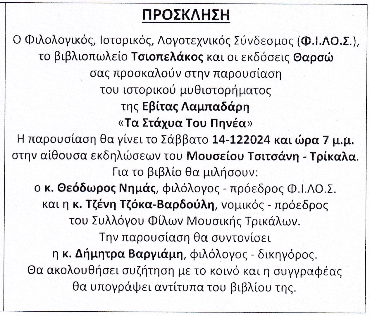 Το προσεχές Σάββατο 14 Δεκεμβρίου 2024 και ώρα 7.00 μ.μ. στην αίθουσα εκδηλώσεων του Μουσείου Τσιτσάνη, θα γίνει η παρουσίαση του ιστορικού μυθιστορήματος της κ. Εβίτας Λαμπαδάρη με τίτλο «Τα Στάχυα του Πηνέα», Αθήνα 2024, Εκδόσεις Θαρσώ, σελ. 436.