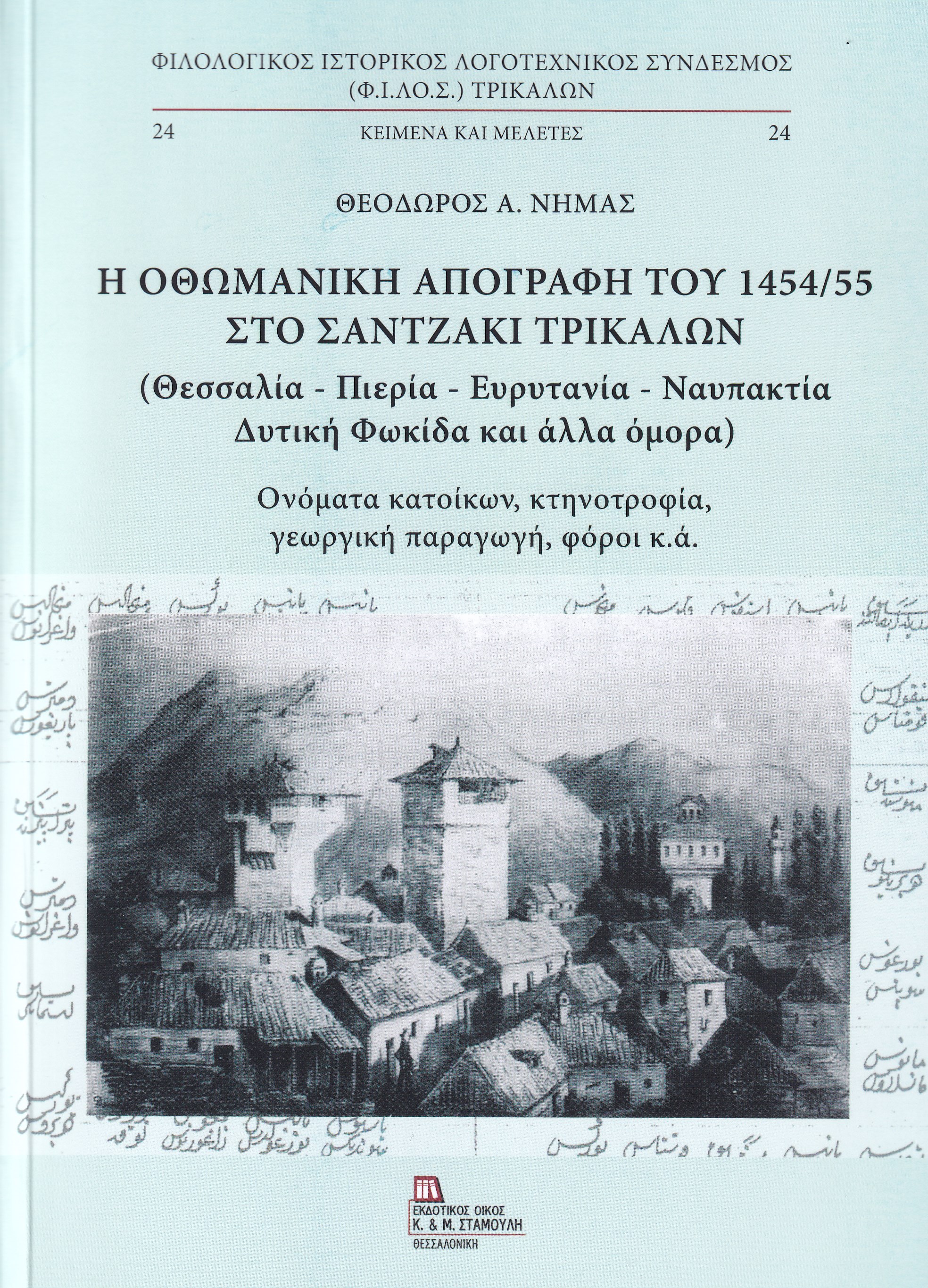Το υπό παρουσίαση βιβλίο αποτελεί μία από τις σημαντικότερες εκδόσεις του Φιλολογικού, Ιστορικού, Λογοτεχνικού Συνδέσμου (Φ.Ι.ΛΟ.Σ.) Τρικάλων και του Εκδοτικού Οίκου Κ. & Μ. Σταμούλη (Θεσσαλονίκη, τηλ. 2310-264748, 6946-461460).  Πρόκειται για το υπ’ αρ. 24 βιβλίο της σειράς «Κείμενα και Μελέτες» του Φ.Ι.ΛΟ.Σ., που περιλαμβάνει ένα από  τα σπουδαιότερα έργα του φιλολόγου και διδάκτορα ιστορίας της Εκπαιδεύσεως Θεοδώρου Α. Νημά με τίτλο «Η οθωμανική απογραφή του 1454/55 στο Σαντζάκι Τρικάλων (Θεσσαλία – Πιερία – Ευρυτανία – Ναυπακτία – Δυτ. Φωκίδα και άλλα όμορα)» και με υπότιτλο «Ονόματα κατοίκων, κτηνοτροφία, γεωργική παραγωγή, φόροι κ.ά.». Το ογκώδες αυτό βιβλίο των 744 σελίδων σχήματος 24Χ17 εκ., που είναι ο καρπός πολύχρονης κοπιαστικής μεταφραστικής εργασίας και μελέτης, πραγματεύεται την οθωμανική απογραφή του 1454/55 στο Σαντζάκι Τρικάλων, το οποίο τότε περιλάμβανε μία πολύ μεγάλη έκταση, ήτοι ολόκληρη τη Θεσσαλία, την Πιερία και άλλα χωριά της Δυτ. Μακεδονίας έως τον Αλιάκμονα προς Βορράν, το Μέτσοβο και τα υπαγόμενα σ’ αυτό χωριά της Ηπείρου, την Ευρυτανία, τη Ναυπακτία και μερικά χωριά της Δυτικής Φωκίδας.