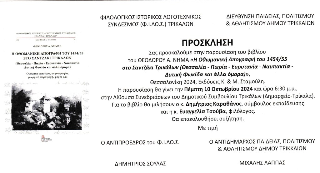 Την προσεχή Πέμπτη 10 Οκτωβρίου 2024 και ώρα  6.30 μ.μ. στην Αίθουσα Συνεδριάσεων του Δημοτικού Συμβουλίου Τρικάλων (Δημαρχείο – Τρίκαλα), θα γίνει η παρουσίαση του νέου βιβλίου του κ. Θεοδώρου Νημά με τίτλο«Η Οθωμανική Απογραφή του 1454/55 στο Σαντζάκι Τρικάλων (Θεσσαλία – Πιερία – Ευρυτανία – Ναυπακτία – Δυτική Φωκίδα και άλλα όμορα)», Θεσσαλονίκη 2024, Εκδόσεις Κ. & Μ. Σταμούλη, σελ. 744.