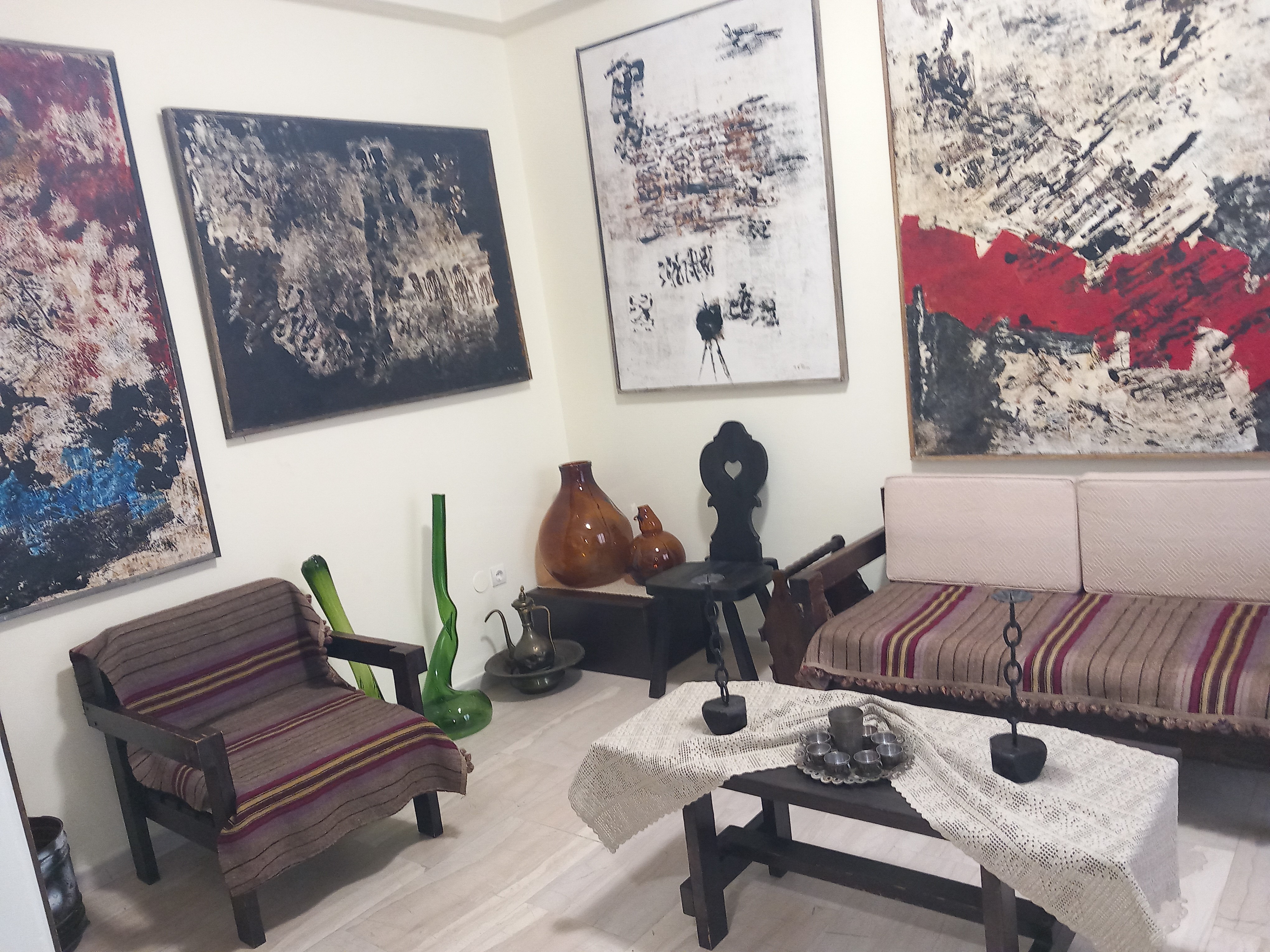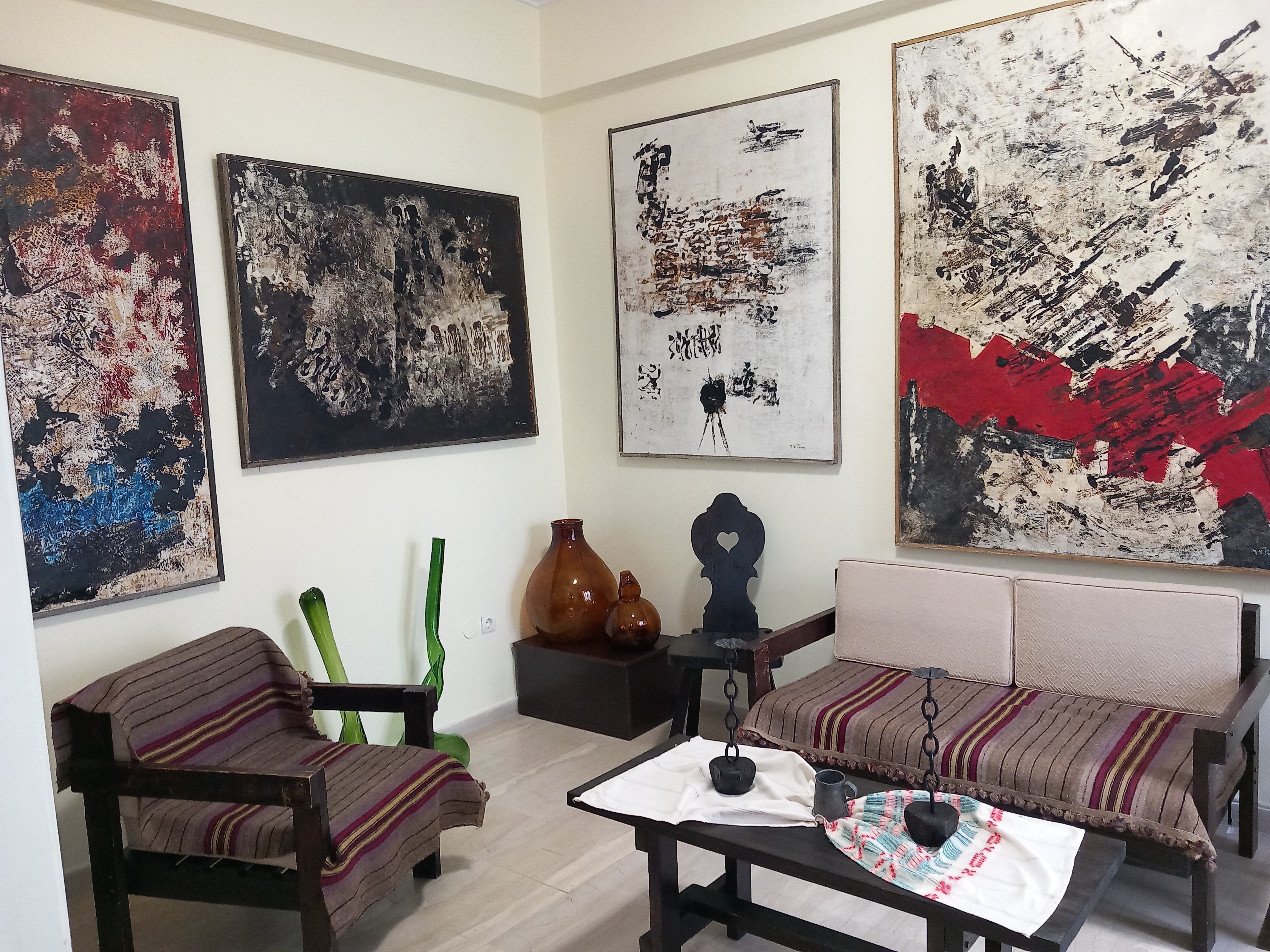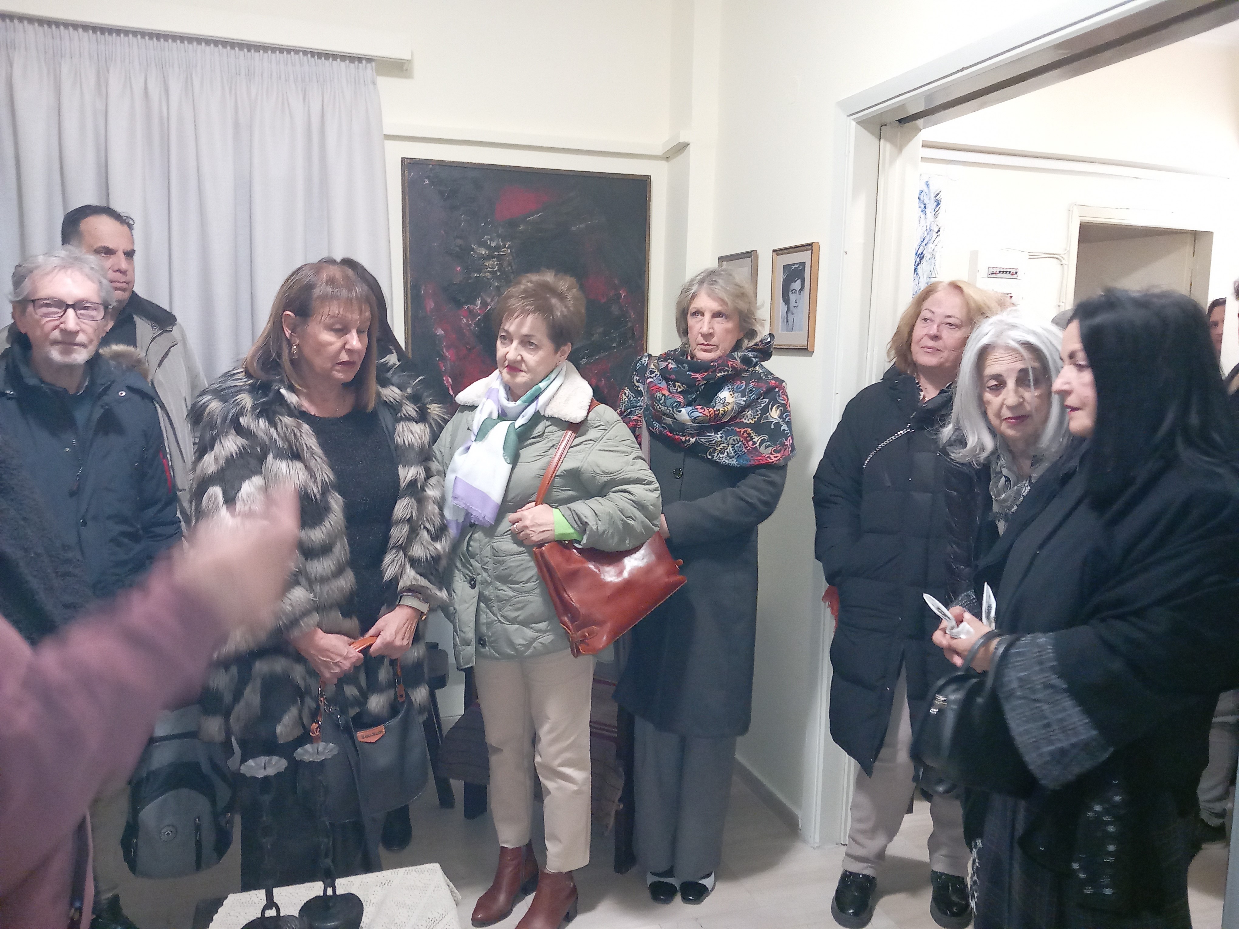 Επακολούθησε ξενάγηση στον χώρο, όπου εκτίθενται οι 19 ζωγραφικοί πίνακες μεγάλου μεγέθους, όλοι έργα της αείμνηστης Μαρίας Χατζηγάκη, τα έπιπλα, τα γυάλινα και τα ορειχάλκινα καλλιτεχνήματα και βιβλία καλών τεχνών της οικογενείας Παν. Χατζηγάκη που βρίσκονταν στο διαμέρισμά της στα Τρίκαλα. Από τους παρισταμένους υποβλήθηκαν σχετικές ερωτήσεις, στις οποίες απάντησε ο κ. Ηλίας Κοτσίρας. Από τον διάλογο που αναπτύχθηκε με τους επισκέπτες, επεσήμανε τον ρόλο της χρυσής τομής στα μεγάλα έργα και πώς η Μαρία Χατζηγάκη την χρησιμοποίησε για την καλύτερη οργάνωση των ζωγραφικών της έργων.