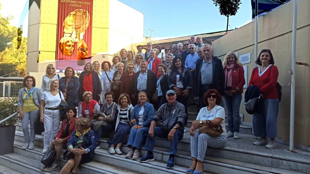 6) Το απόγευμα οι εκδρομείς του Φ.Ι.ΛΟ.Σ. επισκέφτηκαν το επιβλητικό Διαχρονικό Μουσείο Λάρισας, ένα από τα μεγαλύτερα και καλύτερα της Ελλάδος, το οποίο βρίσκεται έξω από την πόλη στη θέση Μεζούρλο. Για την ίδρυσή του ο Δήμος Λαρισαίων έχει παραχωρήσει στο Υπουργείο Πολιτισμού έκταση 54 στρεμμάτων. Εκεί τους υποδέχτηκε και τους ξενάγησε λεπτομερώς η διευθύντρια της Εφορείας Αρχαιοτήτων Λάρισας και του Μουσείου κ. Σταυρούλα Σδρόλια. Οι επισκέπτες θαύμασαν τα πάμπολλα και με ιδιαίτερη φροντίδα τοποθετημένα θεματικά σπουδαία αρχαιολογικά ευρήματα (αγάλματα, κοσμήματα, αγγεία, ψηφιδωτά, τοιχογραφίες, βυζαντινές εικόνες και άλλα) στις ευρύχωρες αίθουσες του Μουσείου.